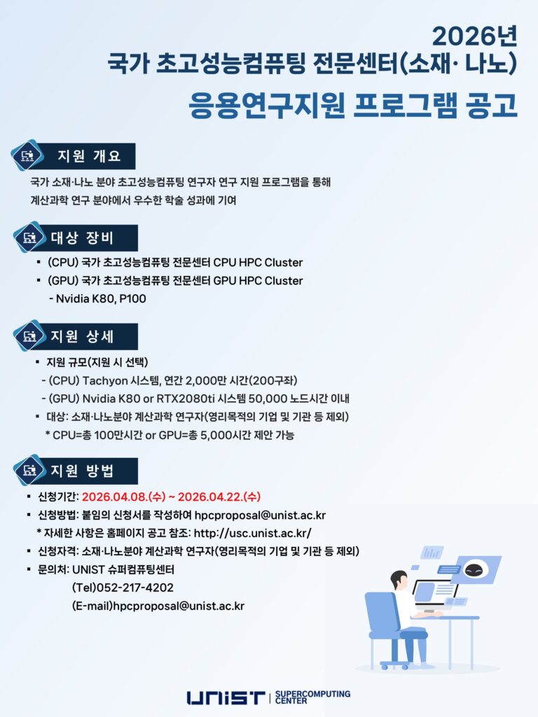 2026 국가 초고성능컴퓨팅 전문센터(소재·나노분야) 연구자지원 프로그램 공모 안내 2026.04.09 울산과학기술원 슈퍼컴퓨팅센터에서는 소재·나노분야에서 고성능계산 시스템을 활용하여 연구를 수행하는 연구자 지원프로그램을 아래와 같이 공개 모집하니 관심있는 연구자의 많은 참여 바랍니다. Download 신청서소재나노분야-2026년도-슈퍼컴퓨팅-응용연구지원-프로그램-신청서kor.hwp 공고소재나노분야-2026년도-슈퍼컴퓨팅-응용연구지원-프로그램kor.hwp 2026-연구자지원-프로그램-포스터.pdf
